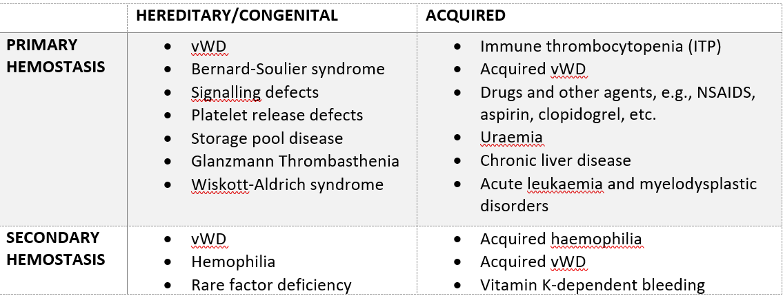 - *Location of bleed: umbilical stump bleed, bleeding post circumcision, epistaxis, gum bleed, haemarthrosis, menorrhagia, post-partum haemorrhage.