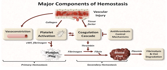 The term hemostasis is coined from “hem-”, which means “blood”, and “-stasis”, which means “to stop.” Hence, hemostasis is a physiological process by which bleeding is stopped at the site of blood vessel injury. It represents an interplay among blood vessel constriction, platelet plug formation, and blood coagulation through fibrin clot formation. Hemostasis is essential for maintaining vascular integrity and preventing haemorrhage. Blood clot formation at the wrong time or site within a blood vessel is termed Thrombosis, and this is a pathological condition.