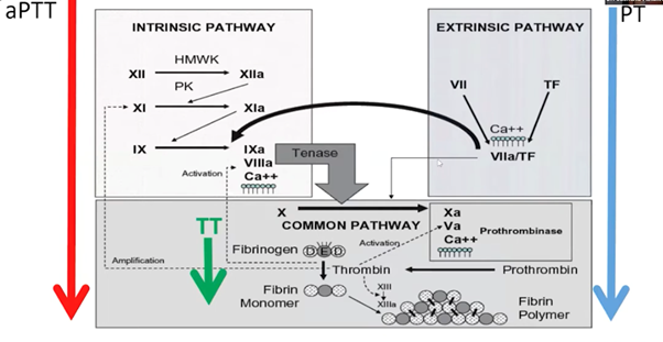 - Coagulation tests: Prothrombin time (PT), Activated partial thromboplastin time (aPTT), fibrinogen assay, thrombin time (TT), clotting factor assays, platelet count